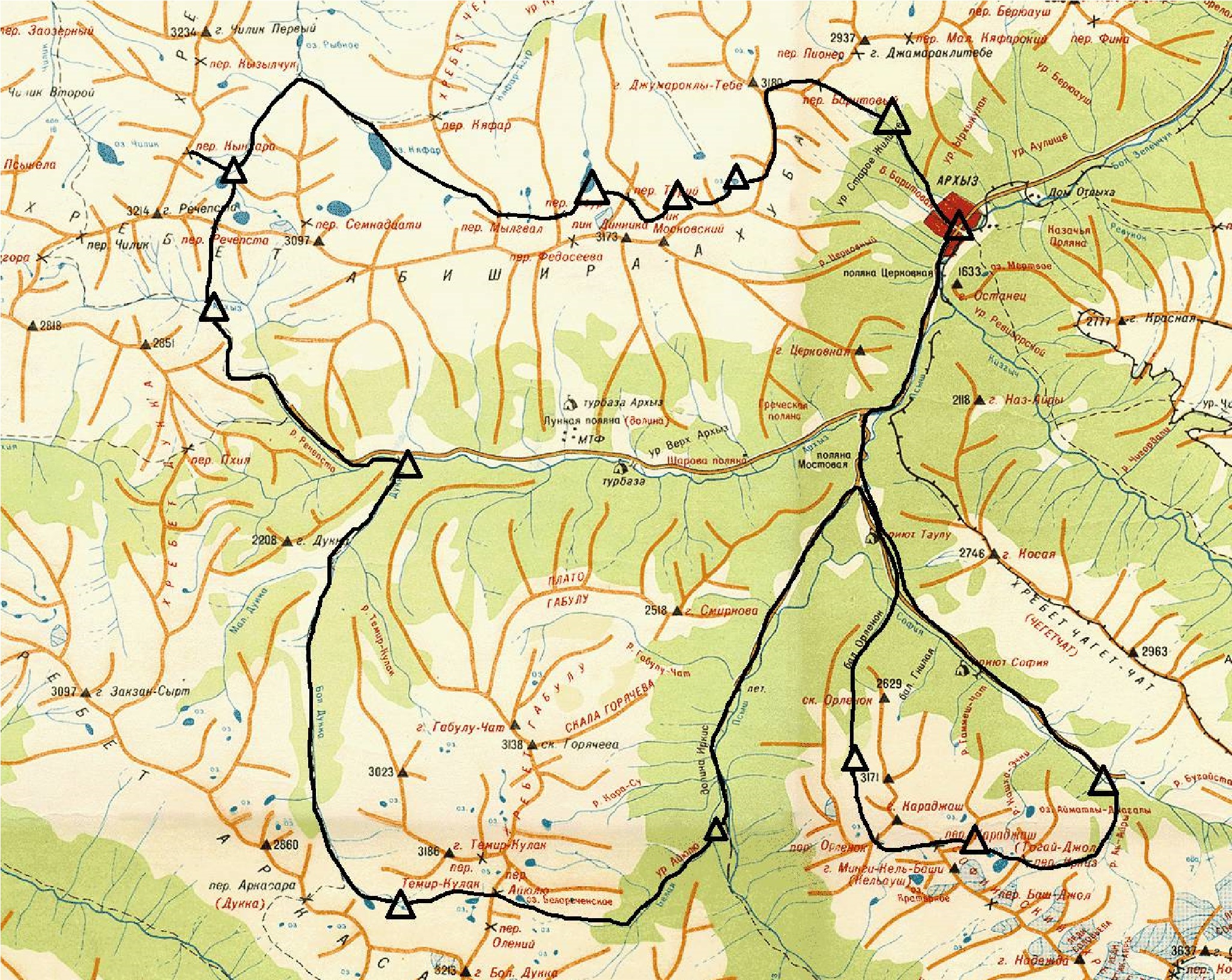 Нитка похода (пройденная) пос. Архыз – д.р. Баритовый – вдп. Баритовый - [пер. Баритовый (н/к, 2800) + пер. Архыз (1А. 2961) + в. Пионеров (1А, 3053) + пер. Грозовой (1Б, 2850)] (связка 1Б) – оз. 2609 – пер. Московский (1А, 2865) – пер. Турий (1Б, 2940) – оз. Турье – [пер. Агур Сев. (1А, 2997) + Мылгвал (1А, 2825)] (связка 1А) – оз. Кяфар – д.р. Кызылчук – оз. Голубое – пер. Кынхара (1А, 2883, рад) – пер. Речепста (1А, 2900) – д.р. Архыз – д.р. Дукка – оз. Семицветное – пер. Аюлю – д.р. Белая – д.р. Псыш – поляна Таулу – д.р. Орленок – пер. Орленок (1Б,3000) – [пер. Караджаш (1А, 2960) – пер. Кельауш (н/к, 2880) – Софийские озера – пер.Иркиз (1А, 2880)] (связка 1А) – д.р. Ак-Айры – д.р. София – пос. Архыз