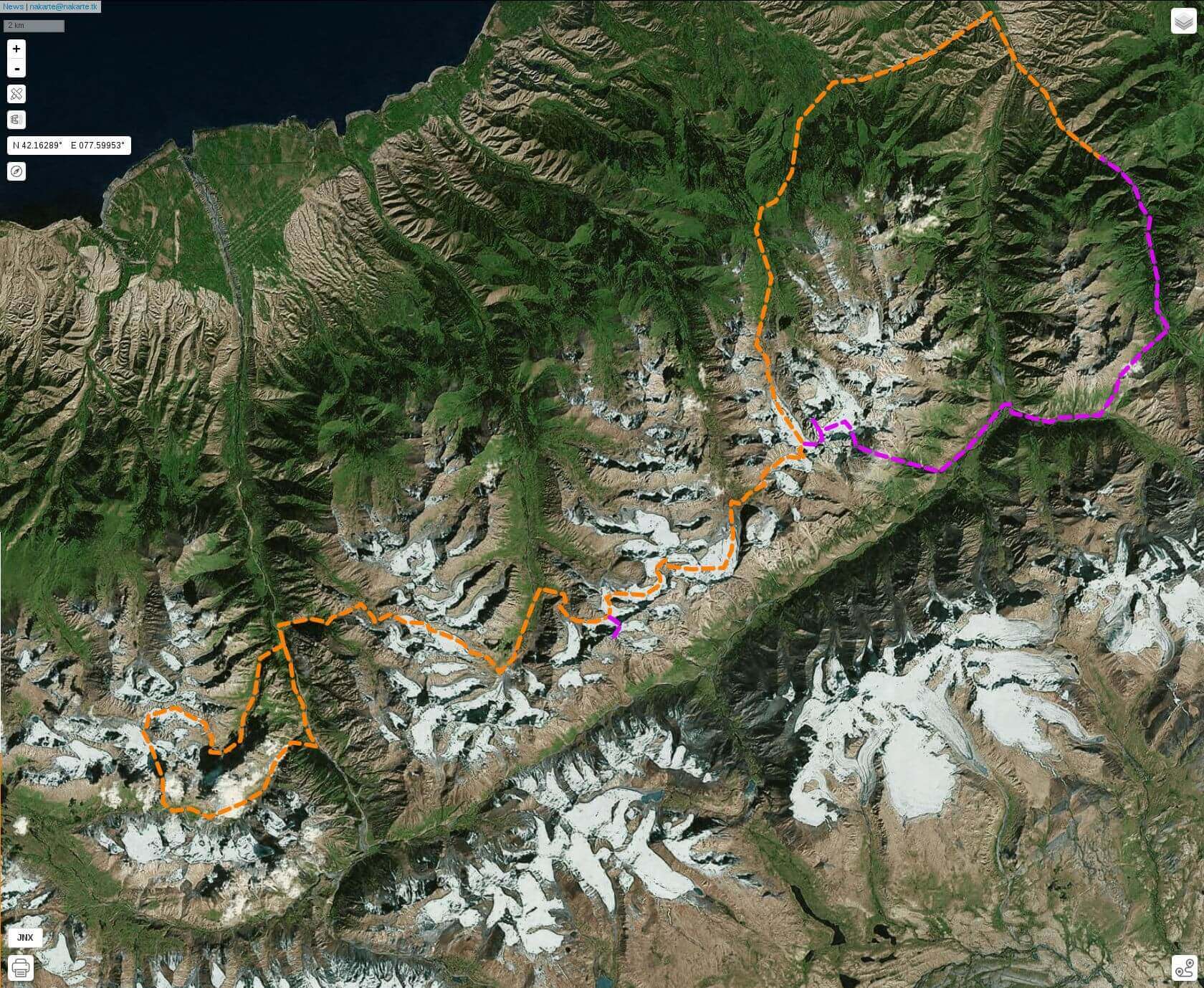 Нитка маршрута Р. Барскоон — пер. Боковой 2А, 4222 (п/п) — пер. Тамгинских инструкторов 2Б, 4266 (п/п) — пер. Альпийских роз н/к, 3740 — р. Жаны-Коргон — р. Барскоон — р. Ачик-Атжаил — пер. Атжаил Колючий 1А, 3604 (тур. п/п) — пер. Ташыл 2А,4300 (п/п) — р. Чонг-Джаргылчак — пер. Октябрьский 2Б, 4025 (п/п) — траверс пика 28 Панфиловцев 2А, 4564 (с элем. п/п) — пер. Лисий 2Б, 4185 (п/п) — р. Ак-Терек — пер. 44 н/к, 2990 — р. Чычкан — пер. н/к, 2400 — р. Джууку — р. Джуукучак —гор. ист. Джуукучак. Обзорная карта района