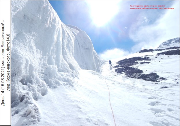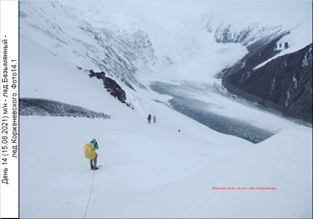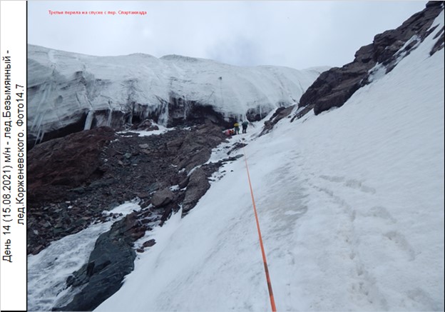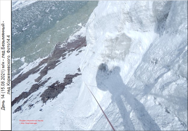 Спуск с перевала Спартакиада начинаем в связках по снежно-ледовому склону, включив биперы (фото14.1). Если бы не снег накануне, пришлось бы, возможно, вешать перила, а так идем на личной технике. Спустившись до скально-осыпных выходов, уходим от классического пути спуска сильно левее (фото14.2), поскольку сверху было ощущение, что там можно спуститься ногами. Тем не менее, спуститься ногами не удалось, поскольку с верхней точки не просматривался борт ледника, за которым находится широкий ранклюфт.