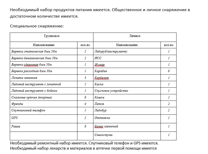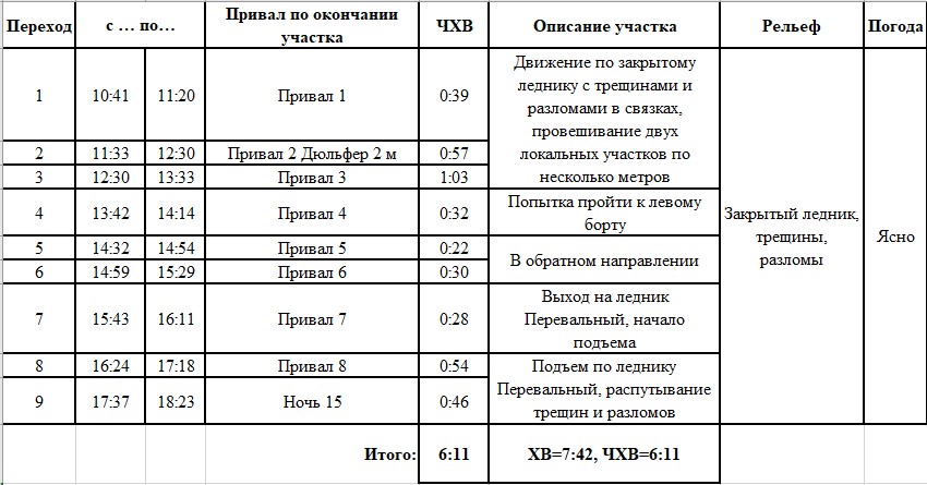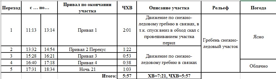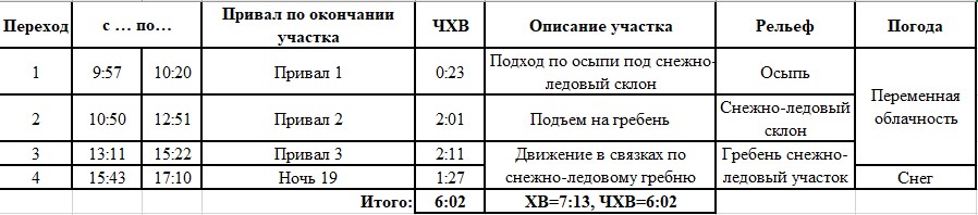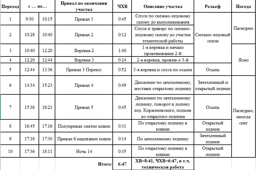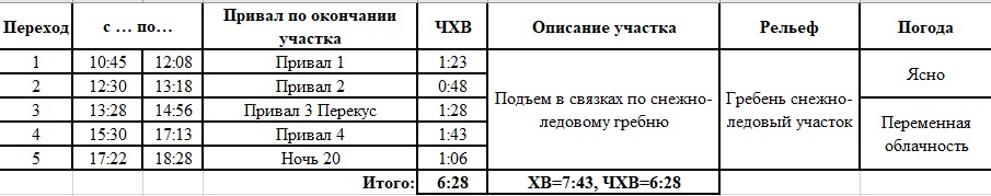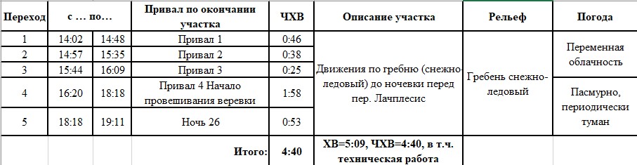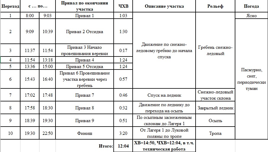 Пройденный маршрут не является слишком сложным технически, но из-за особенностей снежно-ледовой обстановки и высотности является очень физически сложным и напряженным, пройденным в довольно трудных погодных условиях.
