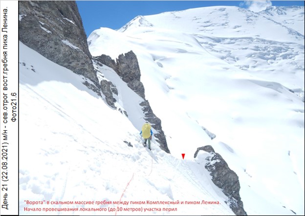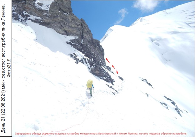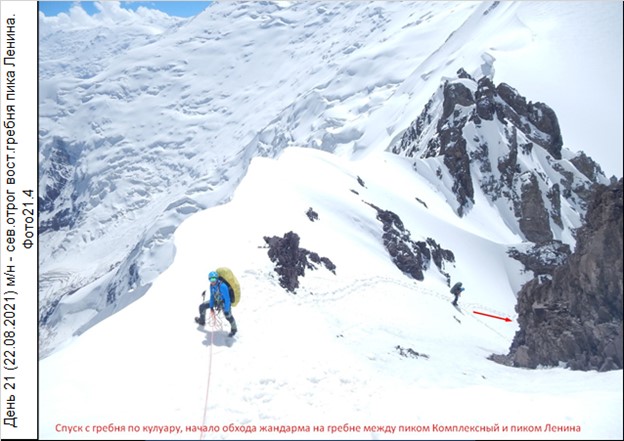 С утра погода ясная. Выходим на гребень. Первый участок пути пологий, виды очень красивые (фото 21.1). Через некоторое время спускаемся на небольшую седловину в гребне (фото 21.2). Здесь начинается участок с выходами скал. Первое время продолжаем движение по верхней части гребня по снегу в нескольких метрах от края карнизов. Поднимаемся на достаточно острый снежно-ледовый перегиб гребня слева по ходу от характерного «зуба» (фото 21.3). С этого места спускаемся на ещё одну небольшую седловинку, используя попеременную страховку для небольшого (метров 10-15) крутого участка спуска. Далее путь движения по гребню преграждает жандарм (фото 21.4, 21.5), зато с этой седловинки вправо по ходу начинается достаточно широкий снежно-ледовый кулуар, которым можно воспользоваться для спуска и начала обхода жандарма. Как только основной скальный массив заканчивается, начинаем забирать влево по ходу в сторону гребня. Двигаемся практически вплотную к скалам чтобы меньше сбрасывать высоту (фото 21.5). В одном месте проходим через скальные «ворота» (фото 21.6), за которыми крутой снежно-ледовый язык. Здесь мы провешиваем метров 10 веревки (фото 21.7). Дальнейшее движение в обход жандарма сложности не представляет. Сначала двигаемся траверсом вдоль скал (фото 21.8), потом начинаем подъем по снежноледовому склону обратно на гребень (фото 21.9).