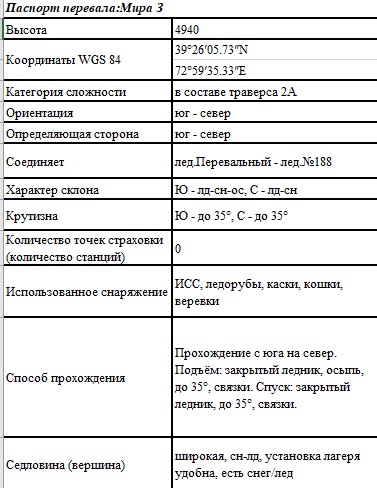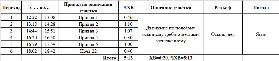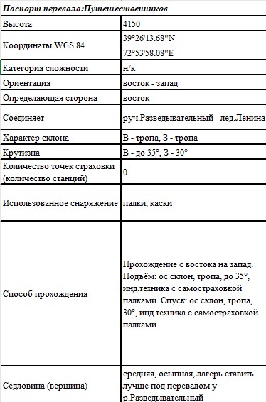 По результатам пройденного, хотим обратить внимание на следующие особенности: - маршрут пройден нами в условиях довольно высокого снегового покрова, в связи с чем в другие годы может оказаться существенно сложнее технически, но проще физически - перевал Запорожских Романтиков имеет прохождение по осыпному склону, соответствующее категории 1Б. Категория 2А для этого перевала явно завышена, прохождение можно осуществить полностью в обход ледника.