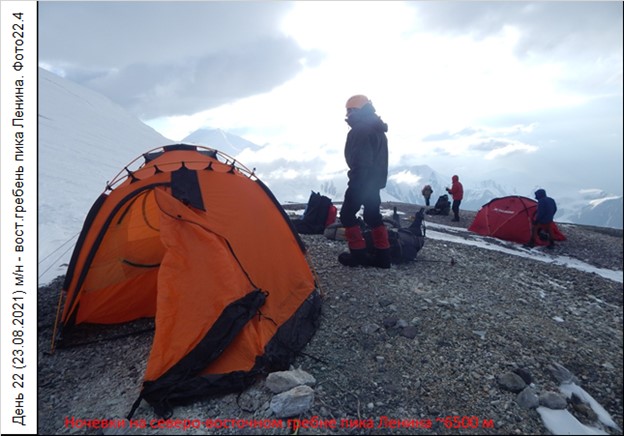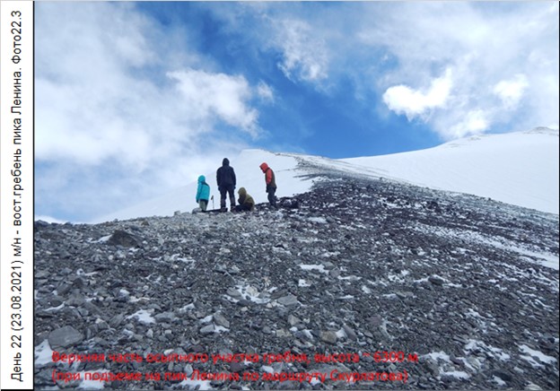 Весь день движемся по осыпной части гребня, путь движения очевиден (фото 22.1). Где есть осыпь, стараемся двигаться по осыпи, чтобы не тропить (фото 22.1, 22.2). Местами идем по снегу, в основном неглубокому. Погода ясная. За день набираем почти 600 метров. Крутизна этого участка пути небольшая, кроме самой высоты никаких сложностей он не представляет (фото 22.3, 22.3). На ночевку останавливаемся в верхней части осыпного участка гребня на высоте 6470 м. В этом месте гребень пика Комплексный, имеющий ориентацию север юг, соединяется с основным гребнем пика Ленина, восточным. Таким образом, заканчиваем движение по северному отрогу восточного гребня пика Ленина. Встаем на ровных осыпных площадках (фото 22.4).