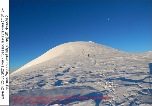 Держим курс на снежный купол гребня и на луну (фото 24.1, 24.2). После подъема на купол открывается вид на пик Ленина (фото 24.3). Необходимо даже немного приспуститься, чтобы начать подъем по заключительной части (фото 24.3, 24.4). Далее преодолеваем ещё пару снежных увалов, периодически закрывающих от нас большую часть гребня пика Ленина (фото 24.5, 24.6).