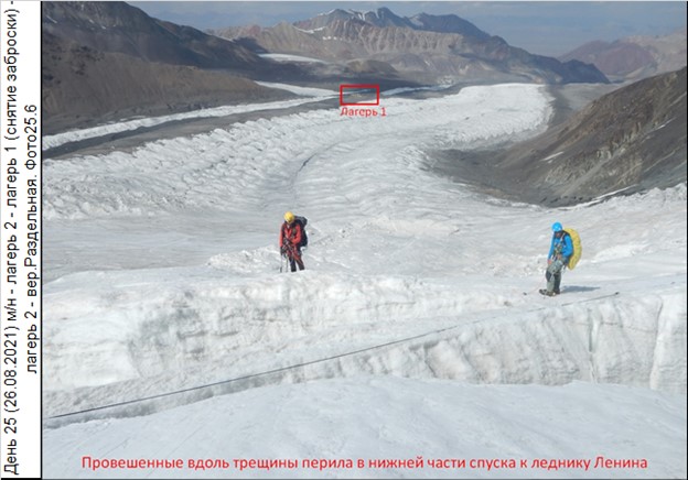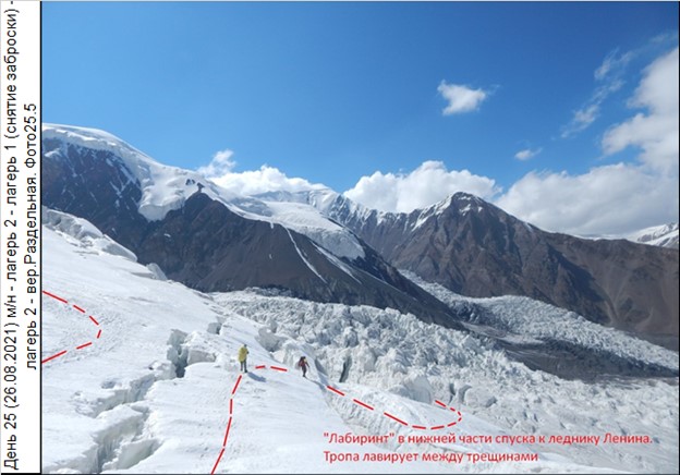 В это день нам необходимо спуститься за заброской, ожидающей нас в лагере 1, и подняться обратно. Погода ясная, тропа на спуск хорошо читается и маркирована вешками. Лагерь 2 «Сковородка» становится виден почти с самого начала спуска (фото 25.1). Доходим до него за один переход. Далее связываемся, так как трещины начинаются практически сразу рядом с лагерем 2 (фото 25.2, 25.3). Хорошо виден наш путь спуска (и нашего будущего подъема) от лагеря 3 к лагерю 2 (фото 25.3). Переходим через небольшое плечо склона, и открывается вид на ледник Ленина и лагерь 1 (фото 25.4). Ещё через некоторое время начинается основной «лабиринт» - тропа начинает лавировать между большими трещинами, в некоторых местах извиваясь практически змейкой (фото 25.5). В одном месте вдоль протяженной глубокой трещины даже провешены перила (фото 25.6). Чуть ниже ещё в одном месте установлена лестница, но она выполняет скорее функции достопримечательности, так как пользоваться ей при нашем состоянии рельефа было намного менее удобно, чем хорошо натоптанной тропой (фото 25.7). Тропа хоть и существенно извивается в нижней части спуска, не теряется, так что навигация сложности не представляет. Далее выходим на открытый пологий ледник и движемся по нему практически непосредственно до лагеря 1, напротив него переходим на морены. В лагере забираем заброску, выясняем, с радостью останавливаемся на обед в кафе одного из лагерей (фото 25.8). Обед обходится нам в 15 долларов с человека, что на 5 долларов дороже чем в базовом лагере, при этом количество и ассортимент продуктов существенно меньше. Впрочем, мы были довольны и этим. После обеда начинаем движение в обратную сторону (фото 25.9). Подъем занимает у нас около восьми часов.