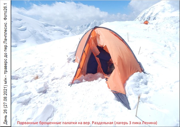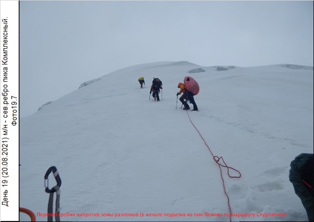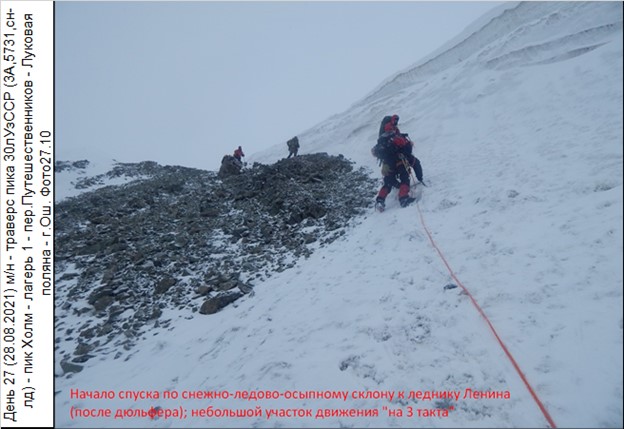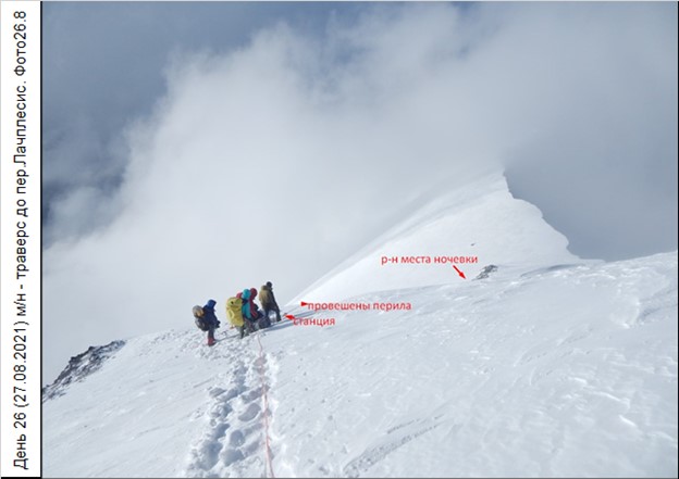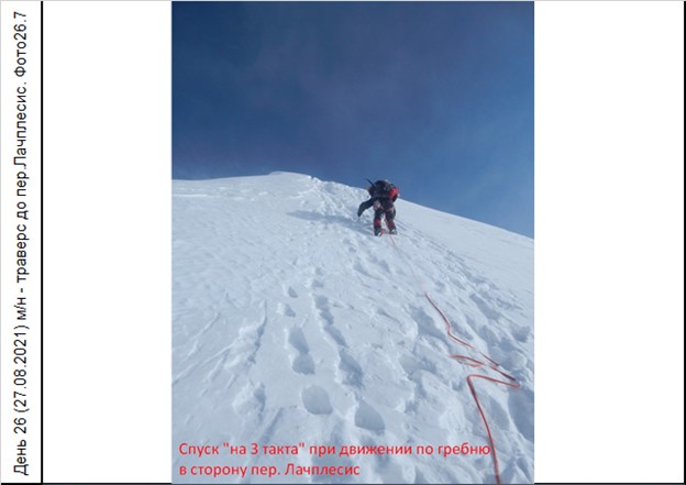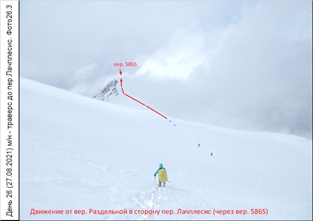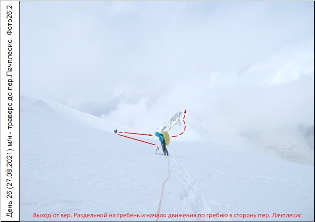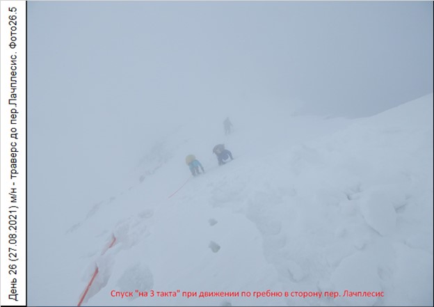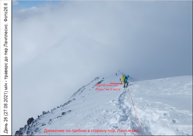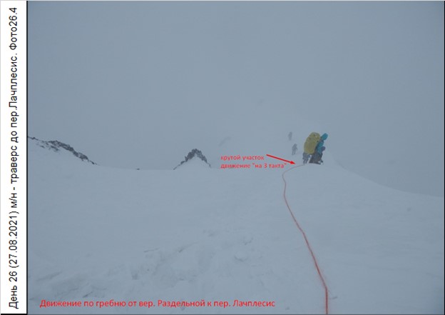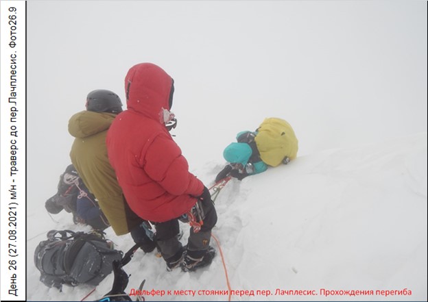 Начинаем двигаться в связках траверсом склонов к гребню пер. Лачплесис (северный отрог западного гребня пика Ленина) (фото 26.2). При движении по этому гребню в сторону Лачплесиса путь проходит через вер. 5865 м, её видно практически с самого начала движения от вер. Раздельной (фото 26.3). С момента выхода на гребень дальнейший путь движения также очевиден (с западной стороны скалы, с восточной стороны крутые склоны, достаточно часто карнизы) (фото 26.4). Погода ухудшается, периодически существенно снижается видимость, но скалы слева по ходу и склоны/карнизы справа, ограничивающие зону нашего движения, всё ещё видны, поэтому продолжаем путь (фото 26.4, 26.5, 26.6). После вер. 5865 м движение проходит приблизительно на одной высоте, с локальными спусками и подъемами, впрочем, местами довольно крутыми. Некоторые из них мы проходим на 3 такта (фото 26.4, 26.5, 26.6, 26.7), при определенных условиях может понадобиться провешивание коротких участков перил. Немного не доходя до пер. Лачплесис выходим на достаточно крутой сброс, начинаем провешивать перила (фото 26.8, 26.9). Как раз за этим сбросом находятся места для стоянок, о которых мы читали в некоторых описаниях. В момент начала провешивания перил видимость хорошая, налетающие облака временно раздуло, но в процессе дюльфера всех участников снова ухудшилась, и по ощущениям улучшения уже не ожидалось, поэтому встаем на стоянках перед пер. Лачплесис (фото 26.10).