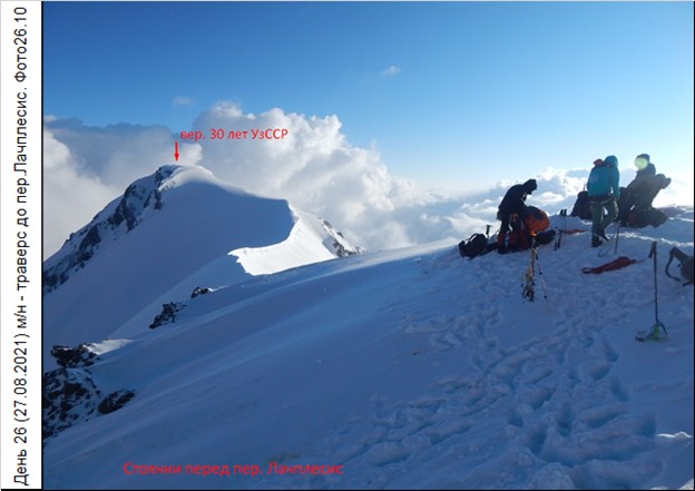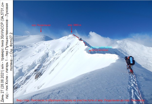 Вершина 30 лет УзССР видна от места стоянки (фото 27.1). Двигаемся в связках по западной части гребня на некотором удалении от карнизов восточной стороны. Видимость хорошая, с перевала Лачплесис виден практически весь путь предыдущего дня от вер. Раздельной (фото 27.2). Поднимаемся на видимую с лагеря вершину. На картах Генштаба вер. 30 лет УзССР обозначена здесь («точка 5731,0»). Мы тоже ставим в навигаторах точку «30 лет УзССР», хотя в месте выхода уже видим, что чуть дальше через небольшую седловинку есть ещё одна вершина, с места выхода она кажется даже чуть выше (фото 27.3). Впрочем впоследствии выяснилось, что со второй вершины выше кажется наоборот первая.