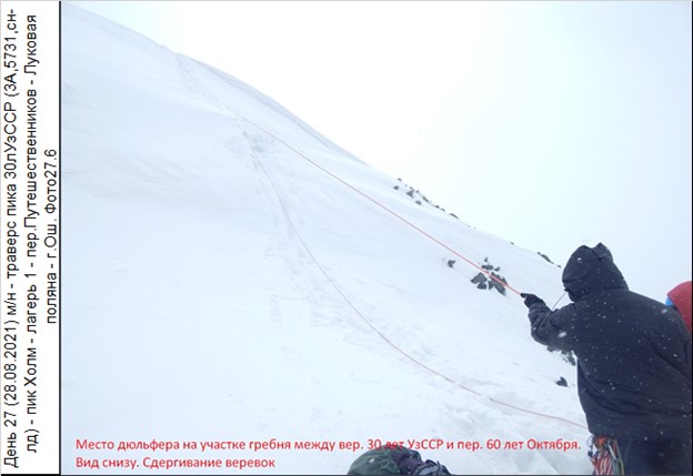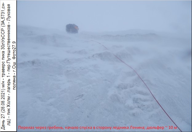 После этого продолжаем движение по гребню и доходим до места дюльфера (достаточно крутой перегиб гребня) (фото 27.5, 27.6, 27.7). Пока группа дюльферяет, видимость то улучшается, то ухудшается, в каких-то окошках успеваем просмотреть дальнейший путь движения (фото 27.7, 27.8). После дюльфера успеваем пройти достаточно длинный переход по намеченному пути движения (также по западной стороне гребня), но потом видимость снова существенно ухудшается, и мы ещё немного отсиживаемся (минут 40). Как только видимость позволяет, продолжаем движение, но погода всё равно оставляет желать намного лучшего. Поэтому, как только с противоположной стороны гребня мы видим склон средней крутизны, допускающий движение на личной технике и просматривающийся достаточно далеко вперед, принимаем решение начать спуск. Для этого провешиваем небольшой участок перил ~10 м через гребень (фото 27.9). После этого проходим небольшой участок «на 3 такта» (фото 27.10), далее несложный спуск по снежно-ледово-осыпному склону с самостраховкой ледорубом (фото 27.11).