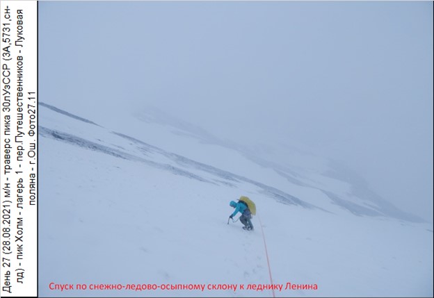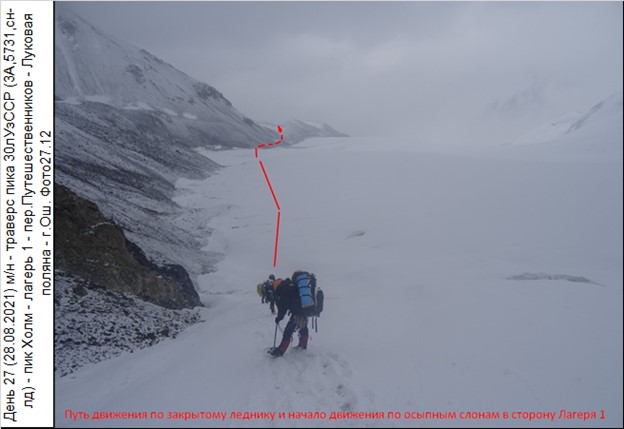 Таким образом, до перевала 60 лет Октября мы не дошли, но наш вариант спуска вполне допустим и оказался для нас несложен (путь спуска на фото 27.8). Путь спуска совпадает с заявленным маршрутом на подъем на первопрохождение 2Б-3А, который мы не пошли. Далее движемся в связках по закрытому леднику. Периодически сыпет снег, все близлежащие осыпные склоны заснежены, но путь вполне просматривается (фото 27.12). Через некоторое время, увидев на осыпных склонах тур, переходим на осыпь в надежде на тропу. Впрочем, тропу мы обнаруживаем не сразу, и при нашем состоянии рельефа (осыпь сильно заснежена) её достаточно трудно придерживаться, но с задачей мы справляемся движемся четко по обозначенной на некоторых картах тропе через так называемый пик Холм (вершину небольшого гребня между гребнем пика Юхина и ледником Ленина, через него обычно ходят от лагеря 1 к пику Юхина, тропа идет прямо по гребню). Видимость и погода снова ухудшаются, но достаточны для продолжения движения, к тому же ближе к лагерю 1 тропа читается всё лучше. Доходим до лагеря 1, он смотрится совсем иначе чем несколько дней назад осыпь почти полностью заснежена.