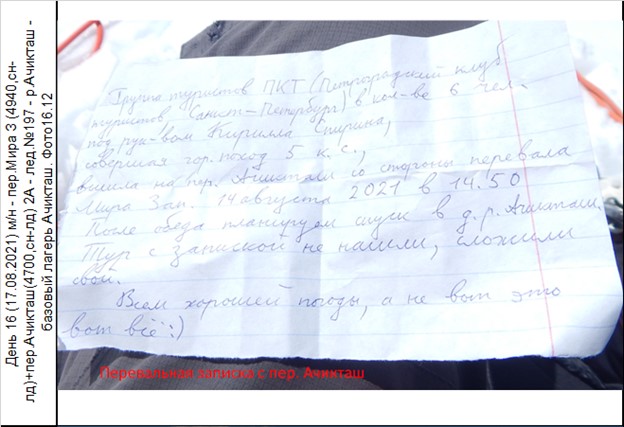 Подъем на перевал начинается перед основной частью скальных выходов на склоне по снежно-осыпному (в нашем случае скорее снежному) склону. Мы поднялись вдоль одной из двух параллельных осыпных полосок (фото 16.6, 16.7). На перевале тура не наблюдается, скорее всего и не водится (сплошной снег, нет осыпных участков). Фотографируемся (фото 16.8) и начинаем движение к пер. Ачикташ (фото 16.9, 16.10). Участок пологий, сложности не представляет, ближе к перевалу Ачикташ нужно обойти разломы (фото 16.10). Перевал представляет собой очень широкую снежную седловину, у подножия ближайшего осыпного склона обнаруживаем тур (фото 16.11). Снимаем записку группы ПКТ под руководством Кирилла Спирина 5 кс от 14.08.2021 г (фото 16.12). Оставляем свою записку, фотографируемся (фото 16.13), начинаем спуск на ледник № 197. Спуск некрутой, несложный, движемся также в связках ближе к северному борту (правому по ходу). В том месте, где заканчивается основной массив закрытого ледника и начинается открытый достаточно разорванный его более узкий язык, обедаем, а затем уходим вправо по ходу на морены (фото 16.14, 16.15). Движение по моренам и моренным карманам очень удобно (фото 16.16), передвигаемся быстро. Доходим до одного из притоков реки, переходим по камням (фото 16.17).