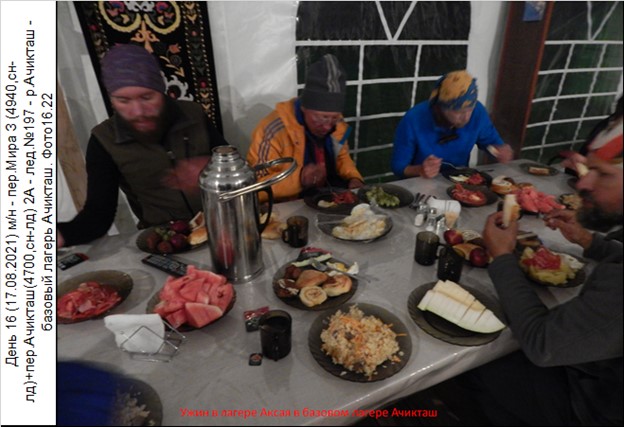 Находим лагерь Аксая, нам предлагают ужин, он кажется нам практически королевским (плов, омлет, фрукты, сладости по системе шведского стола и в достаточно большом количестве) (фото 16.22). Обходится нам в 10 долларов с человека. После этого нам поясняют, где можно поставить палатки, и мы располагаемся лагерем. На следующий день дневка.