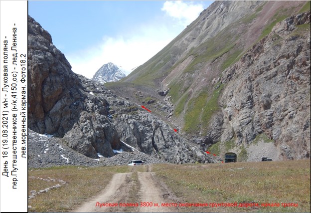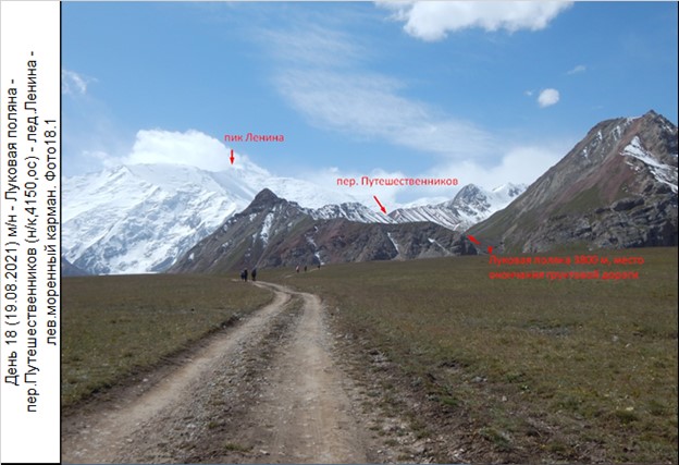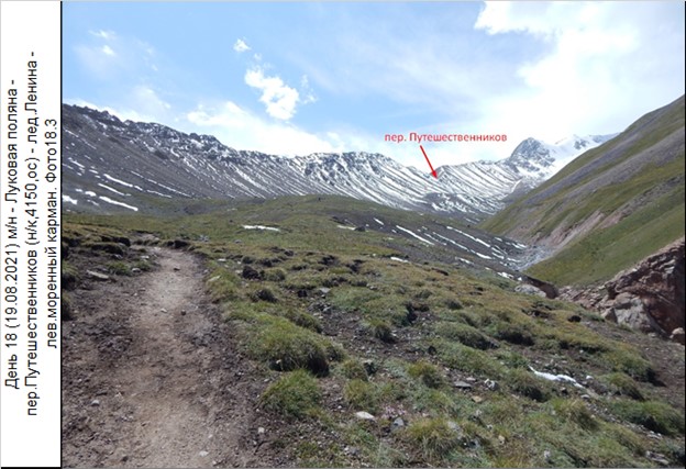 По хорошей погоде собираем лагерь и начинаем движение в сторону перевала Путешественников. Полтора перехода идем по грунтовой дороге (фото 18.1), доходим до таблички «Луковая поляна 3800 м». Здесь дорога заканчивается. Дальше идем по тропе (вначале тропа поднимается на скальную ступень) (фото18.2, 18.3). На третьем переходе от базового лагеря начинаем подъем на перевал. Туда ведёт хорошо натоптанная, местами крутая зигзагообразная тропа (фото 18.4). Тропа сильно раскисшая, местами каша по щиколотку и выше, поэтому тем, кто заранее не переобулся в горные ботинки, пришлось сделать вынужденный привал. В 14:41 поднялись на перевал Путешественников (фото 18.5).