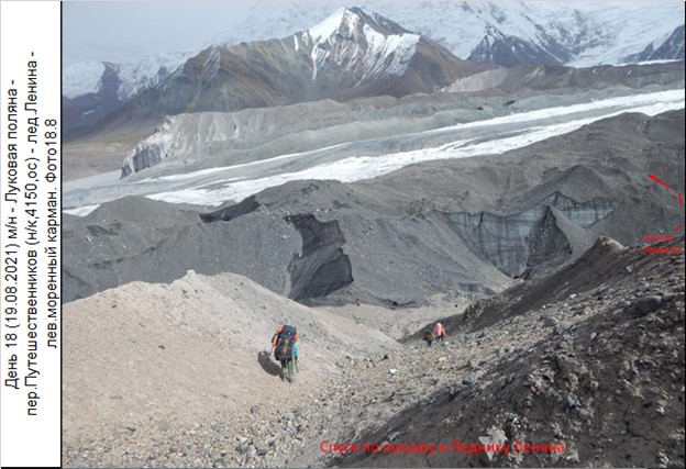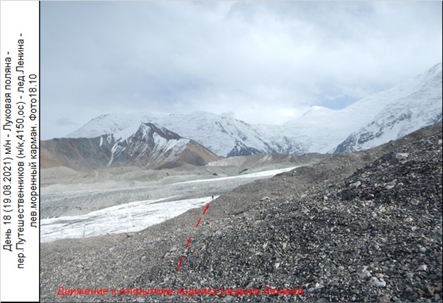 Далее начинаем спуск по тропе (фото 18.6). В ходе движения присматриваем варианты спуска на ледник Ленина (сама тропа уходит вверх над скалами к лагерю 1, нам же нужно пересечь ледник Ленина раньше). Приемлемый вариант спуска находим спустя примерно 40 минут движения осыпной кулуар до небольшого русла реки на границе ледника, откуда подъем на ледник достаточно пологий (фото 18.7). Спуск требует самостраховки ледорубом, но в целом сложности не представляет (фото 18.8).