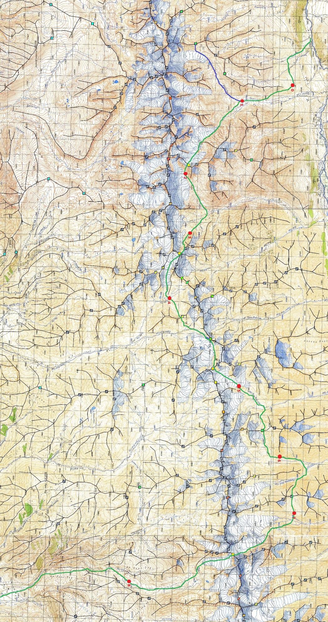 1 Траверс в. 4122 включает в себя п/в (1А) на пер. Гегеля. 2 При прохождении перевалов категории сложности 1Б, при движении по закрытым ледникам, группа двигалась в связках. Карта пройденного маршрута Красным показаны примерные места и номера ночёвок зелёным – нитка основного маршрута синим – радиальные выходы. День 0