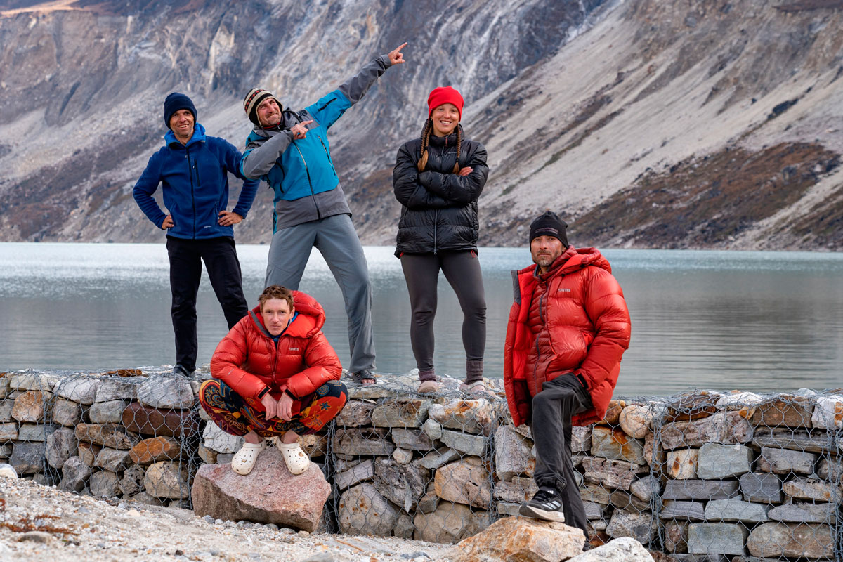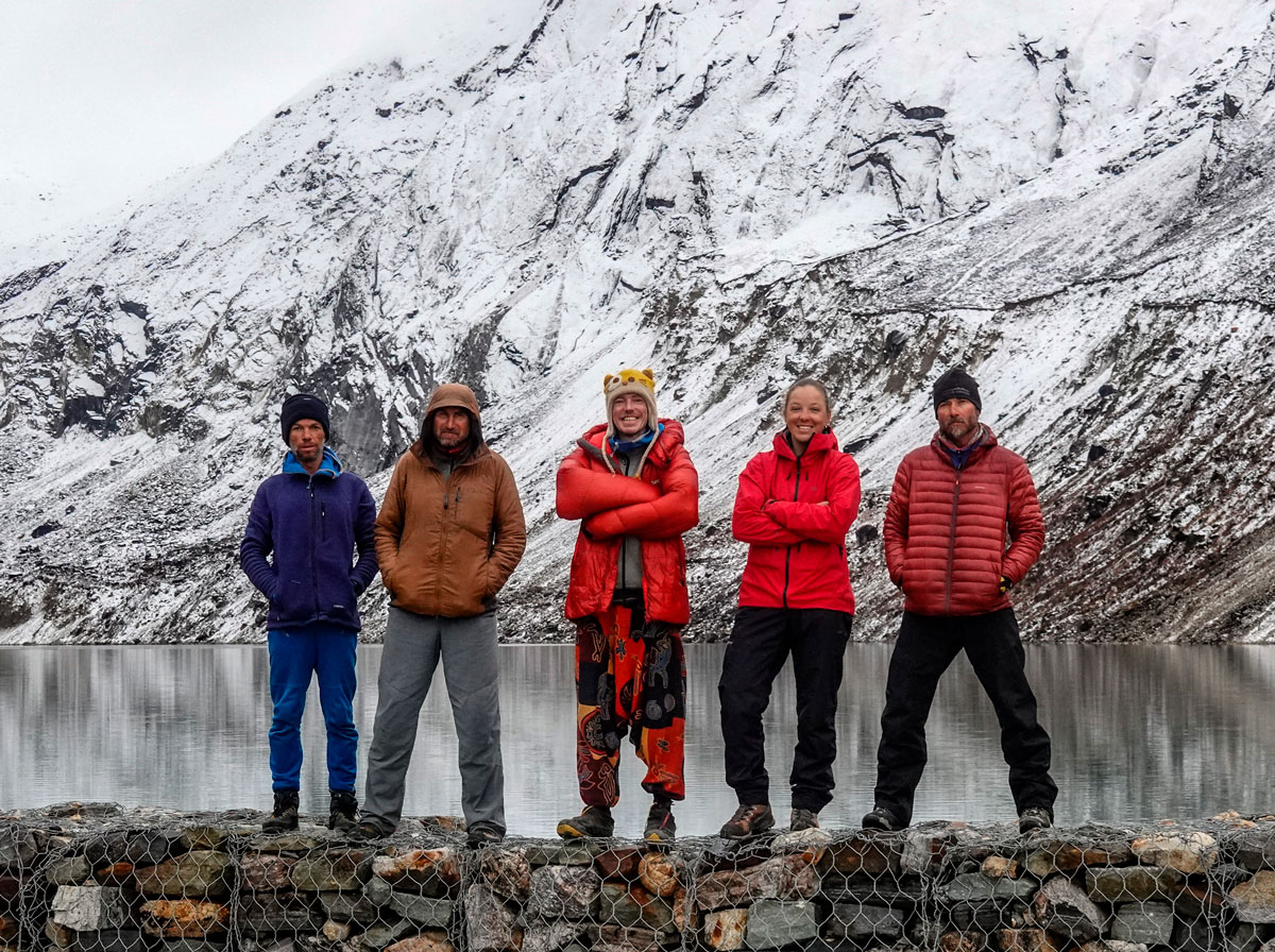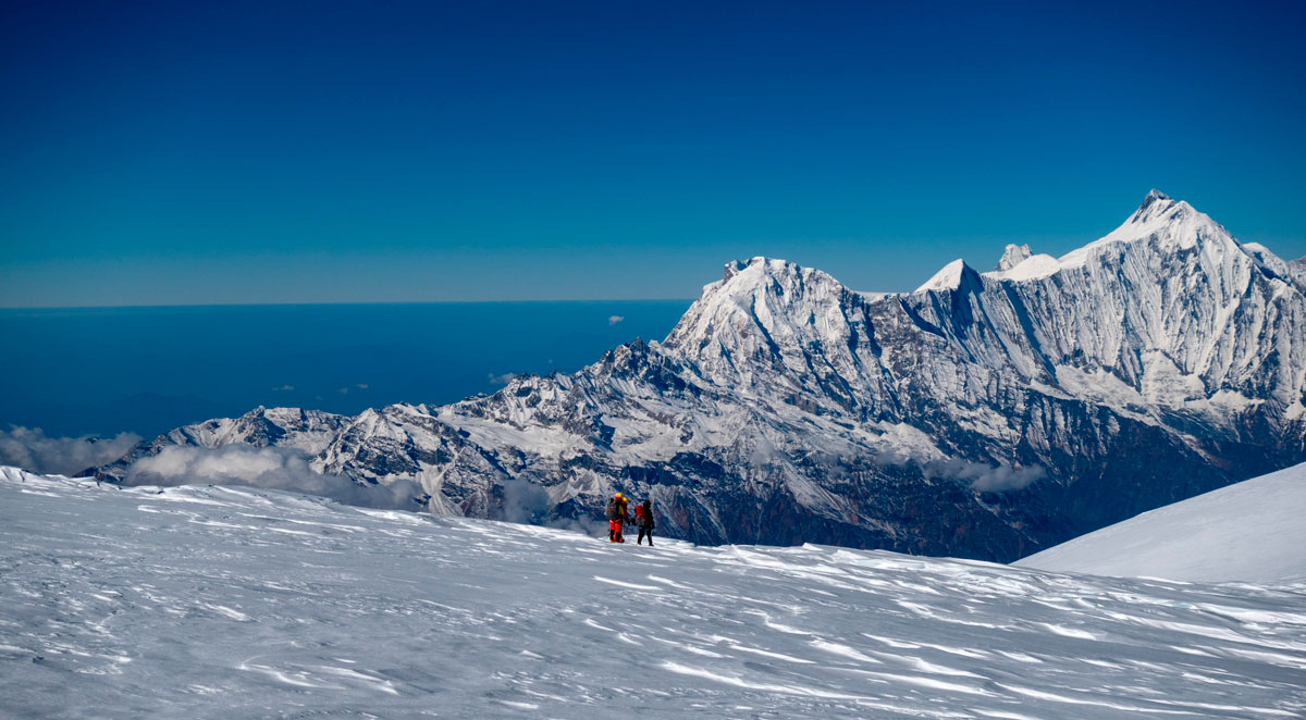 Идем в сторону нашей ночевки, я просто иду за Сергеем. Встречаем и собираем все свои вешки. Последние метров 500 до нашей ночевки идем по треку инрича. Здесь приходит осознание, что восхождение удалось! Поздравляем друг друга, все вместе обнимаемся. У нас получилось! Мы прошли маршрут по ЮЗ стене Манаслу и спустились целыми и невредимыми!