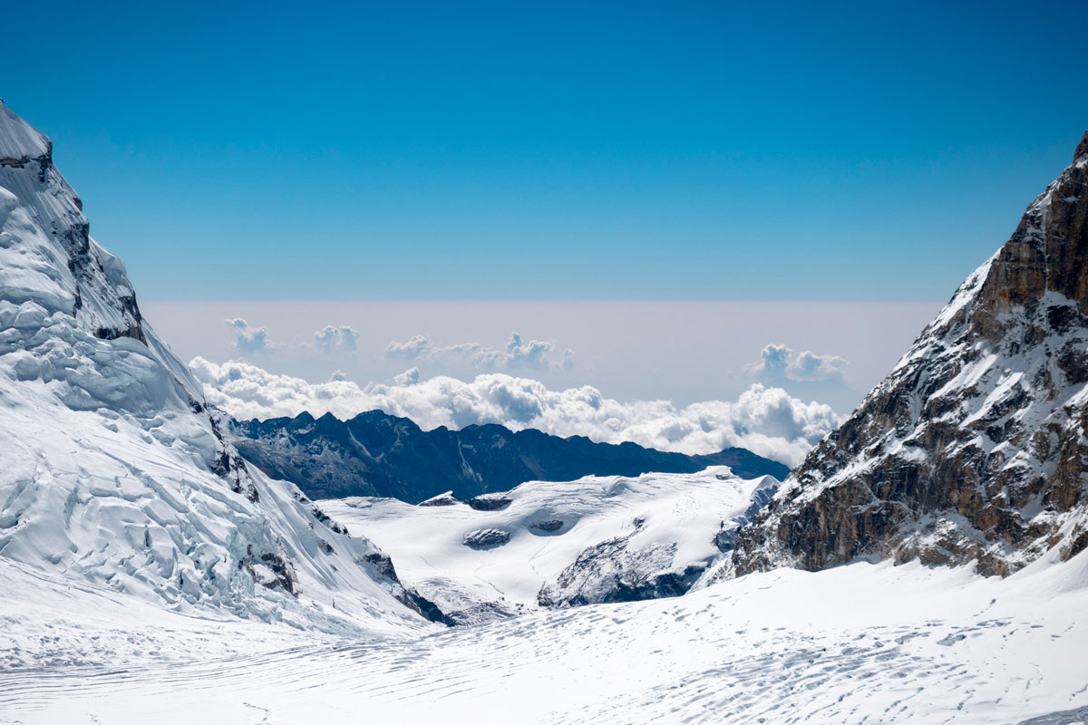 Наконец, ледопад кончается, и мы спускаемся на пологий ледник. Дальше нужно пройти под нижней ступенькой ледопада, откуда часто валятся ледовые обвалы. Сережа виртуозно выбирает путь, обходя трещины и проходя по краю свежих лавинных конусов так, что опасность минимальна. Наконец-таки напряжение спадает, ведь опасность позади.