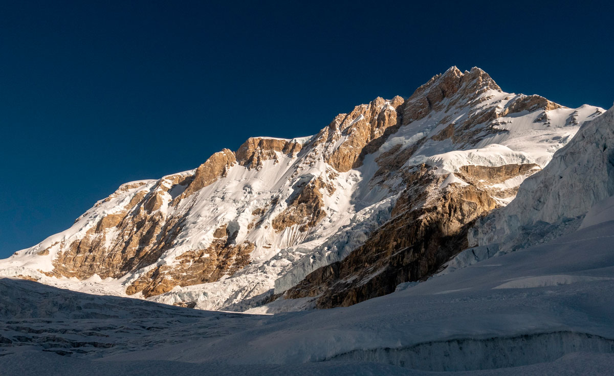 25 октября. Еды мало, усталость давит. Сегодня надо пройти пологий ледник и выйти к ледопаду. Желательно к его середине, чтобы на следующий день пораньше пробежать опасные места. Но идти тяжело. Несмотря на то, что наши следы сохранились, тропить надо. Не доходим, ночуем перед началом ледопада. Решаем выходить не супер рано, чтобы ближе к вечеру прийти к опасному участку (кулуар Тулаги, откуда периодически, вытаивая летят камни) и проходить его, когда солнце уже какое-то время не будет освещать его.