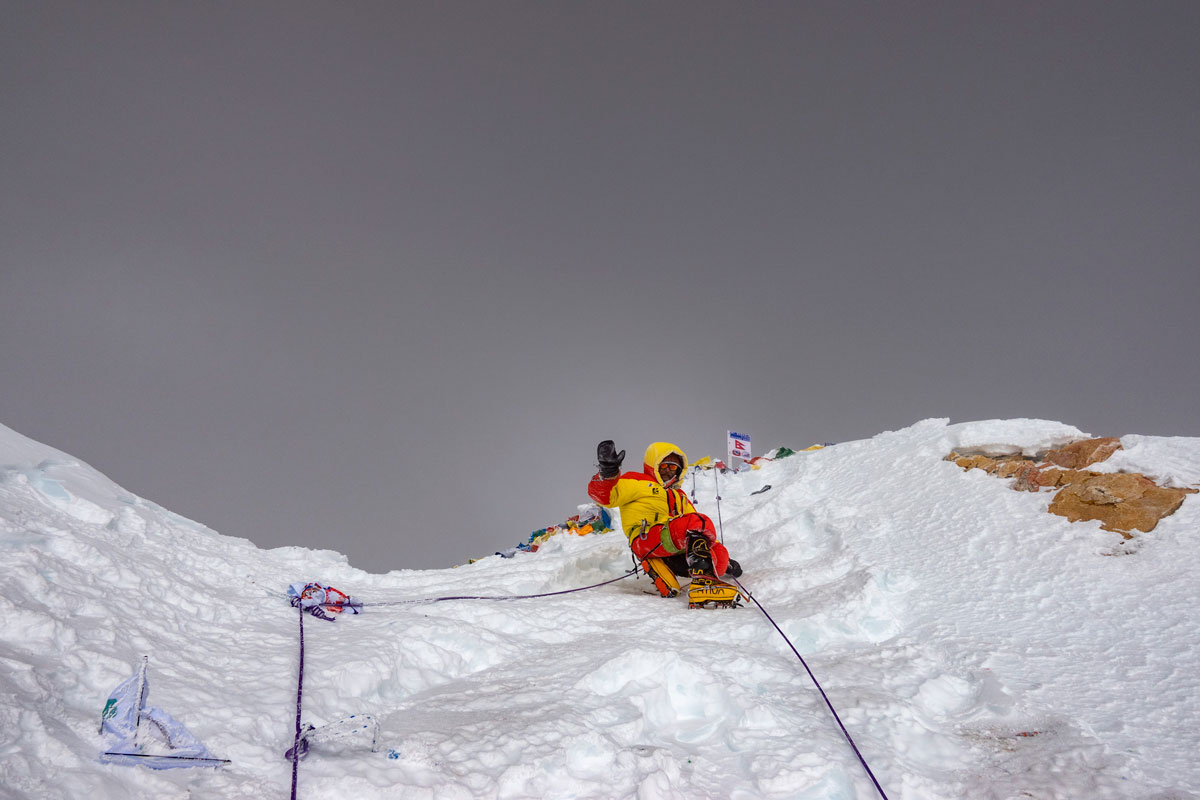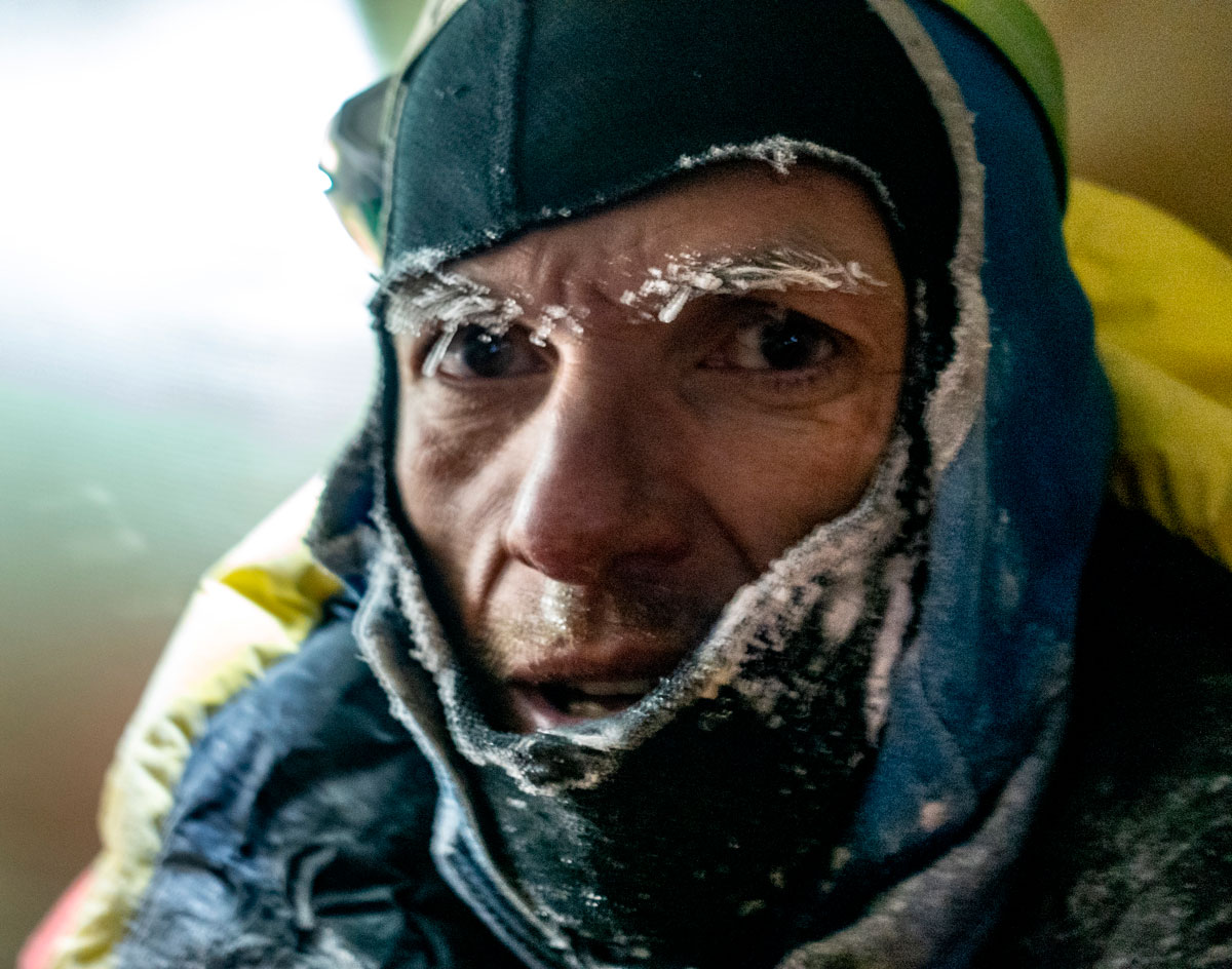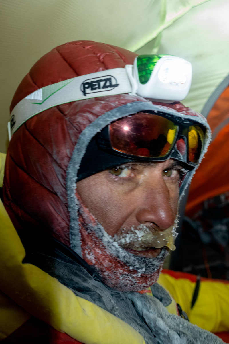 22 октября. По прогнозу ветер 55 км/ч, температура -25. Берем две веревки, какое-то снаяжение и идем на вершину. Видимость очень плохая. Направление ветра ЮЗ. На гребне от ложной вершины к настоящей ветер бешенный. Сережа вешает веревку. Время близится к вечеру. Максимально быстро кто с кем поднимаемся на вершину – мы с Сергеем в 15:50, фото и вниз, потом Кирилл с Наташей и замыкающий Виталик. Никаких групповых фото, радостных обнимашек, как можно быстрее. 20 секунд и вниз. Это было опасно. В один момент налетела какая-то чернота и ветер влупил так, что мы просто прижались к земле, дышать было трудно. Хорошо Сергей уже прошел гребень и был где-то за перегибом, а остальные еще не начали движение. К палатке пришли уже стемнело, пришлось немного ее поискать. Гаджеты все уже давно сели или почти сели, хранили заряд на инриче, в этот день писали трек.