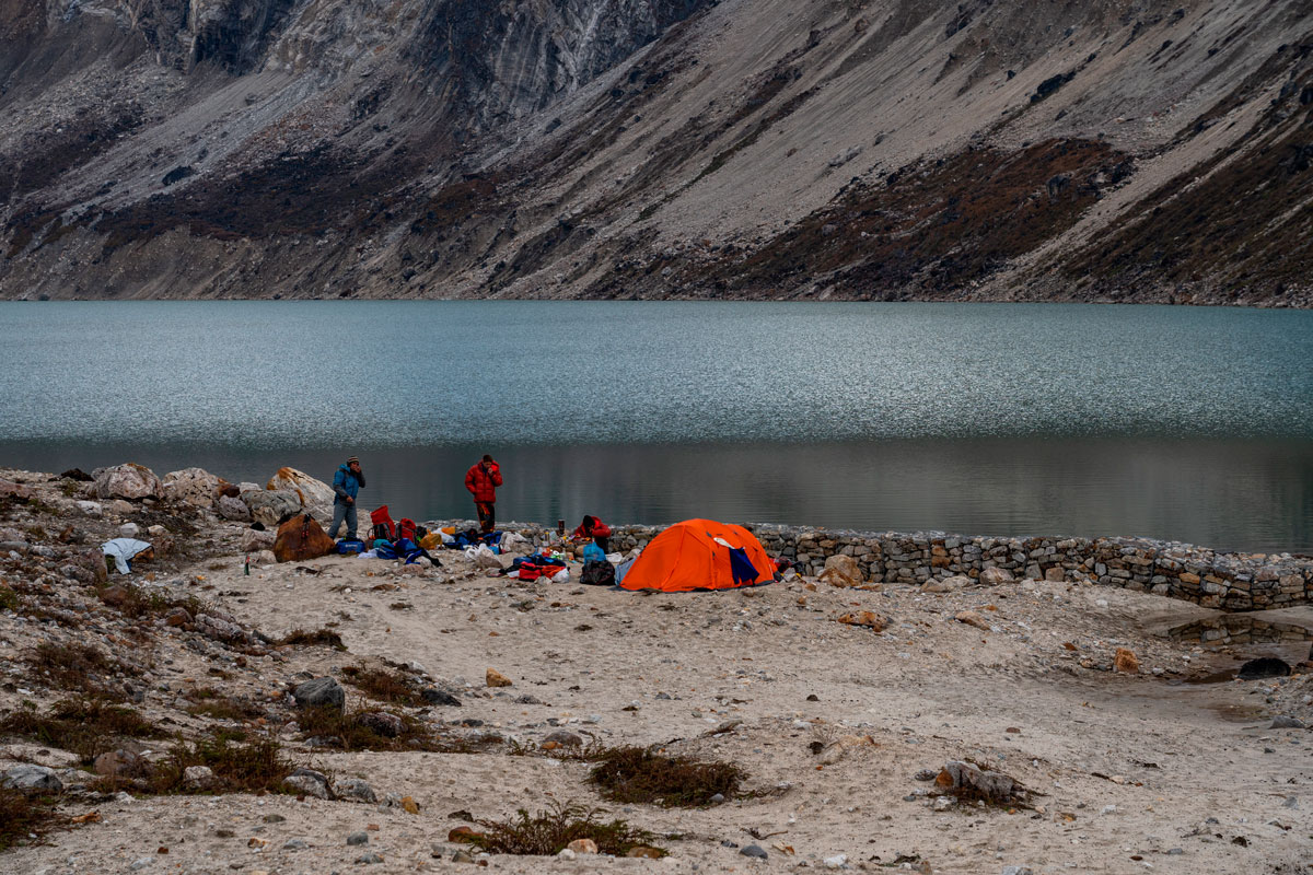 Прибыли в БЛ на озере Dona Lake (4100) 9 октября. 11 октября портеры забросили весь ваш груз (мы не смогли найти достаточно портеров, поэтому они делали две ходки). Наш базовый лагерь – одна палатка, 5 человек, прямо на берегу красивейшего озера на песчаном пляже. Песок нас будет преследовать еще долго и высыпаться из всех щелей. Сейчас мы в Катманду, все номера, коридор завалены мокрыми вещами, и повсюду песок.