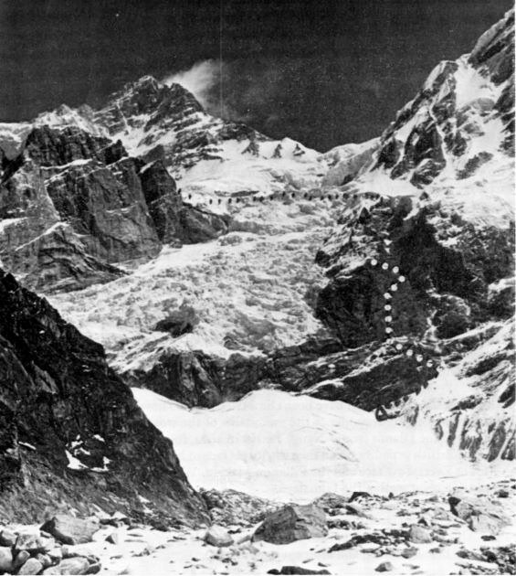 12 октября вышли из БЛ на восхождение. До основания ледопада 1 день и 2 часа утром ходу. Шли по правому берегу по склону морены. То вверх, то вниз, неприятная осыпь, утомительно. Остаток дня потратили на наблюдение за ледопадом. По единственному доступному фото из старых экспедиций его провешивали справа по скалам. Там много технической работы, нам такой вариант не подходил.