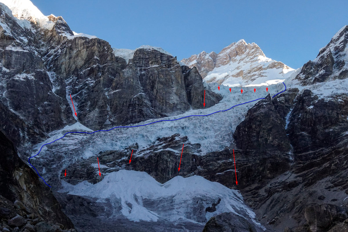 14 октября вышли в 4 утра. Мы прошли без завески веревками, в левой части. Идется одновременно. Опасность представляют ледовые обвалы в центральной части нижней ступени ледопада и кулуар на склонах Тулаги, из которого с выходом солнца летят камни. Далее пересекли ледопад и прижались вправо к скалам, ночевка на ледопаде, 5400. Здесь повесили одну веревку по льду и с утра одну на скальную ступень. Вышли на пологие скалы, засыпанные снегом (встретили следы очень старых веревок). По ним и правой части ледопада по крутым фирновым склонам вышли на пологую часть ледника Тулаги (утро 15 октября). Пройдя ледопад мы однозначно поняли, что приезжать сразу сюда и акклиматизироваться тут неприемлемо - слишком опасно. Если еще добавить непогоду, снегопады, то опасность станет совсем уж зашкаливающей.