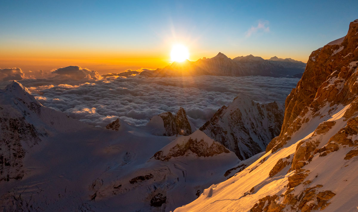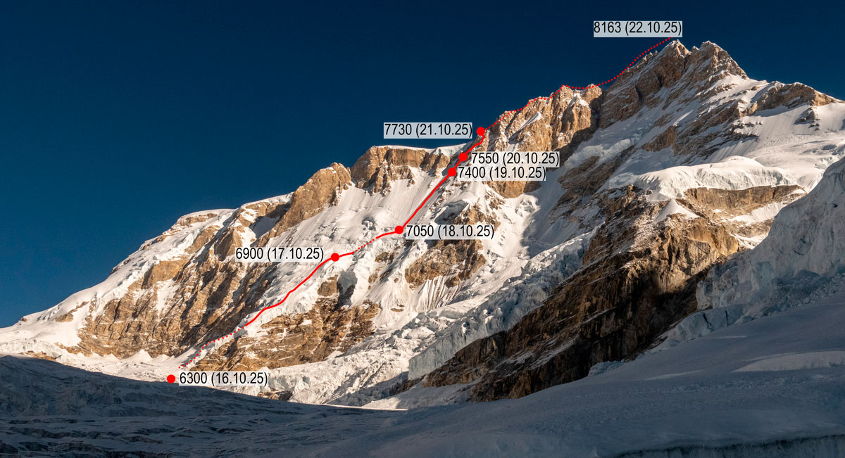 Идем в сторону нашей ночевки, я просто иду за Сергеем. Встречаем и собираем все свои вешки. Последние метров 500 до нашей ночевки идем по треку инрича. Здесь приходит осознание, что восхождение удалось! Поздравляем друг друга, все вместе обнимаемся. У нас получилось! Мы прошли маршрут по ЮЗ стене Манаслу и спустились целыми и невредимыми!