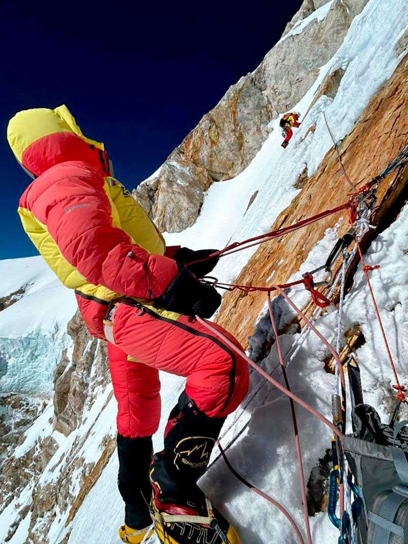 19 октября. Подъем в 12 ночи. Поднимаемся по перилам и двигаемся дальше. Склон крутой. Лидер двигается без серьезного труда, достаточно быстро, насколько позволяет высота и рюкзак. Страховка организуется очень трудно. У нас есть все, что бывает для организации страховки на снегу, фирне, льду. Но здесь почти везде приходится колдовать. Здесь не надежны ни ледобур, ни дэдмен, ни фирновый уголок. Уходит очень много времени. В обед на плато усиливается ветер, сходят мелкие пылевые лавинки.
