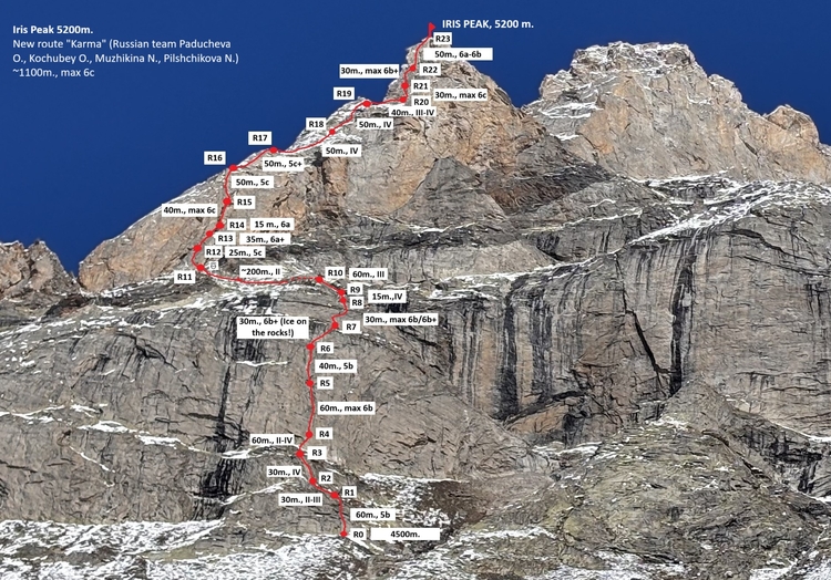 4. Индийские Гималаи, пик Ирис (5200 м), маршрут «Карма» 1100 m: 650 m 6c, ED + 550 m PD/AD первопрохождение, О.Падучева, О.Кочубей, Н.Пильщикова, Н.Мужикова