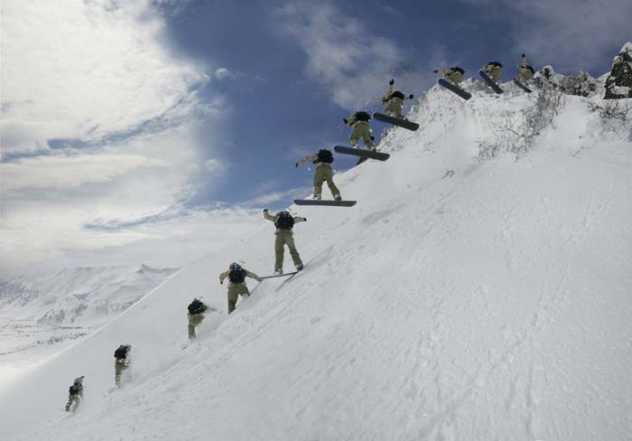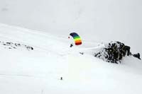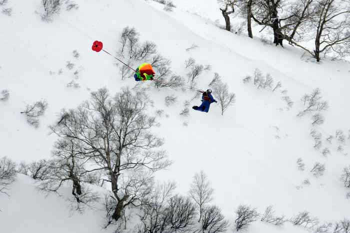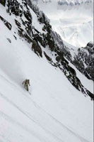 a snow-board rider descending on the same slope.