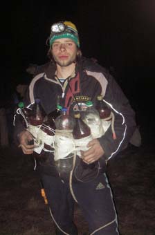 «Босой» - такое название. Надеваем самодельную обувь - кто из чего… Мы - из полиэтилена и войлока. Бегом к следующему КП, причем без фонарей - освещать путь надо самодельным светильником. И, как показывает опыт, нормальный фитиль, помещенный в двухлитровую банку, светит ватт на шестьдесят!!! Торопимся, бежим. Специфика этапа в том, что ноги без подошв «вибрам» частенько имеют плохое сцепление с дорожным покрытием. Поскользнешься, бывало, осмотришься, детей нет рядом, и только ночное эхо…упруго впитывает твоё накопившееся чувство!!! И так со всех сторон….