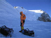 Сегодня утром взяв палатку (тяжело конечно, но мы хотели, чтобы C2 был удобным), спальные мешки и продовольствие, мы поднялись очень быстро, так как очень хотели успеть пройти седло. С 7300 мы начали также провешивать перильные веревки. Большая часть сегодняшнего подъема проходила по скальной части, что было не трудным, но опасным из-за подвижных камней и хрупкой скальной породы. До седла мы добрались уже когда солнце ушло из вида и стало чрезвычайно холодно. Пока ставили палатку, мы обследовали ребро и обнаружили его часть, которая немного защищена от этого ужасного, сильного и замораживающегося ветра. Хотя большая его часть совсем на защищена, но все же... Мы решили попытаться выйти на штурм вершины завтра! Молитесь за нас! И следите за нами!