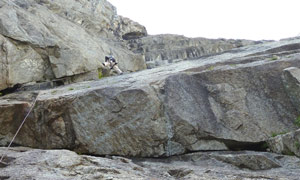 После трёх питчей E3 5c вылезли к разрушенному скальному участку, очевидного прохода через который не нашли.