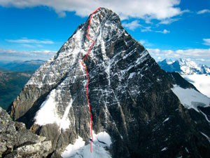 Первая половина идёт по кулуару, который упирается в микстовый участок. Большая часть маршрута снег и лёд с уклоном 60о, пишет Колин, некоторые участки 70о-86о, много лёгких секций.