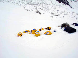 Под палящим солнцем снег на склонах гор стремительно тает. Следствием этого таяния стала бандитская пуля размером с лошадиную голову и весом около 20 кг, пробившая насквозь одну из палаток в Camp 1.