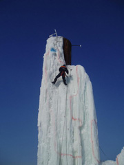 Второй день Чемпионата начался недалеко от Томска на башне в пос.Мирный с мороза около -25 и финала у мужчин на сложность. Им было предложено пролезть комбинированную трассу по льду с элементами драйтулинга (сухого лазания) по кирпичной кладке, переходом на ледовые бочки под карнизом и финалом на железном балкончике. Если первым участникам удавалось пролезть лишь половину маршрута, то в конце спортсмены разогрелись и Василию Терехину (клуб ТАКТ) даже удалось финишировать - так он стал первым Чемпионом Томской области по ледолазанию. Правда, чтобы отогреться после выступления, ему пришлось бегать кругами вокруг башни почти 10 минут.