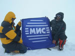 На вершине Чо-Ойю флаги спонсоров, участники и плохая видимость. В компании с участниками: альпинист из Японии и восходительница из Южной Кореи. Восхождение было совершено из лагеря 2 (6950 м).