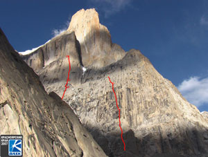 Сегодня, 7 июля, четверка в составе: А.Михалицин, Е.Беляев, И.Логинов, А.Комиссаров, - стартовала с рассветом по своему маршруту первопрохождения по Северо-Западной стене Большого Транго. Мы подходили непосредственно под начала обоих маршрутов и посылаем фотографии.