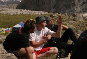 Сегодня на маршруте работают Сережа Нилов и Андрей Мурышев. Денис и Женя отдыхают в платформе, общаются со мной по радиосвязи. На данный момент пройдено больше 300 метров стены. Вечерами на горе чил-аут. В рацию несутся звуки музыки, в ночной мгле со стены то и дело мелькает свет фонариков.:-)