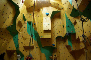 Его уникальность в том, что находится он в специально построенном именно для скалодрома здании необычной формы - 4 этажа вспомогательных помещений (гардероб, раздевалки, туалеты, души и т.п.) и сам спортзал со стендом.