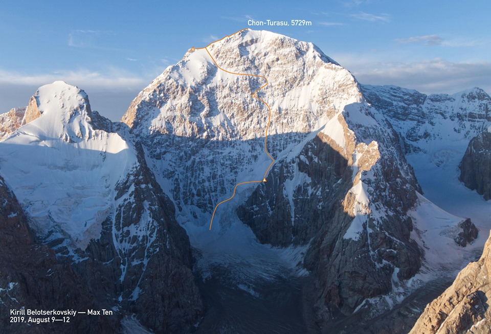 Маркевич Константин, Сушко Денис, Семенов Валерий Сложность маршрута оцениваем, как 6А 640 м (препад), max 6B+, M6 От штурмового лагеря на леднике до перемычки на высоте 5550 - крутой снежный склон - 50-60 градусов. От перемычки - стенная часть - 7 скальных и микстовых веревок по 60 метров. Средняя крутизна стены - 70 градусов. Утром первого дня восхождения пролезли снег до перемычки, оставшийся день пережидали непогоду, на следующий день сходили скальную часть и спустились на перемычку, поспали несколько часов и ранним утром следующего дня спустились вниз. Весь маршрут пройден свободным лазанием, без использования ИТО Источник: Константин Маркевич, Москва | ||||||||||||