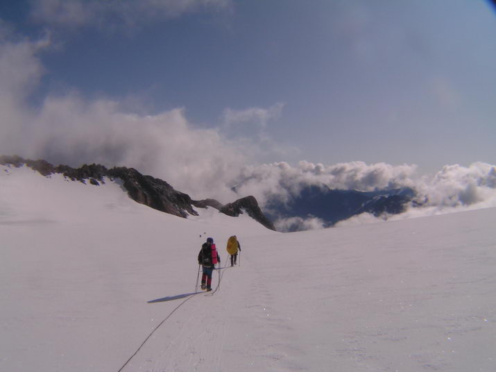Крутизна склона до сорока градусов. Почти от самой седловины вешаем 4 веревки...