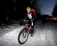 ...Накатанная дорога кончается и дальше по лесу идет колея от КАМАЗа. Если удается удержать велик в колее - ехать можно, если нет - падаешь в сугроб. Встречные лыжники не смеются, а сочувственно улыбаются...