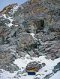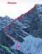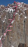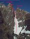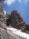 Путь по скалам логичен, встречается старое железо, есть немного разрухи. После пяти веревок скал начинается ледовый гребешок, выводящий на основной гребень (4 веревки).