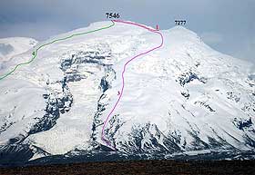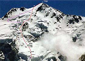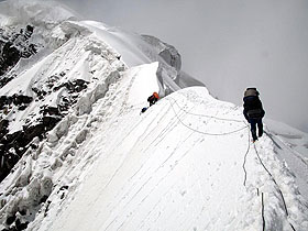 Основная сложность восхождения по северо-восточному гребню - протяженный подъём по снежно-ледовому склону средней крутизной 35 град., на взлётах до 45 град. В зависимости от сезона и места на склоне здесь встречаются и открытый лёд и жесткий фирн и глубокий снег.