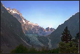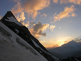 Вечер, однако, выдался теплый, умеренная облачность скорее ласкала, чем припугивала, поэтому мы охотно прогулялись в сторону Башкары. Вернулись к заходу солнца и уже из палатки наблюдали феерическую картину закатного соединения нависавшего Джантугана с удаленным Эльбрусом.