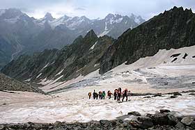 Стук и «фырканье» первого булыгана услышали пока шли вправо вдоль бергшрунда к началу маршрута. «Ага! – отметил я про себя, - По левому краю бьёт, значит верно, в описании по правому краю идти советуют!»