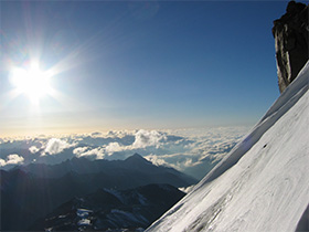 «Можно, я пойду?.. Кто сказал, что на Эльбрус легко?...» - мне хочется разрыдаться. Пошла, а оказалось, что вот и вершина – огромное снежное гладкое поле! Слева видна Западная. Солнце выходит из облаков оранжево-золотым куполом – очень красиво! Надо бы порадоваться и повосхищаться, но ничего этого нет, никакой радости, ни чему вообще…