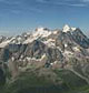 Вблизи – гребень Чегема, вдали за ним Коштан, Дыхтау, Безенгийская стена и Тетнульд. На фоне стены Тихтинген...