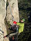 Большая часть маршрута проходится свободным лазанием, ИТО на весь маршрут около 30 метров. Страховка остаточно надежна. Первые две веревки почищены от камней и мусора.